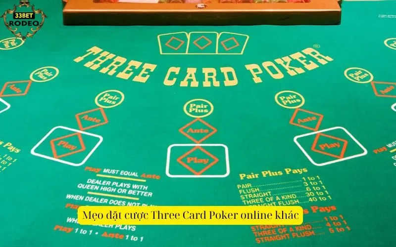 | Pair Plus | Cược dựa trên giá trị bài của bạn | Pair: 1:1, Flush: 4:1, Straight: 6:1, Three of a kind: 30:1, Straight Flush: 40:1 |